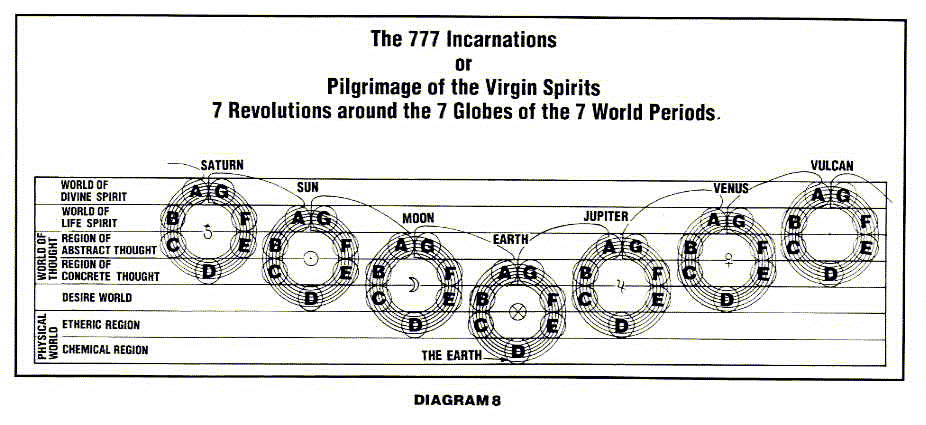 The Globes of the Earth Period are located in the four densest states of matter--the Region of Concrete Thought, the Desire World, the Etheric, and the Chemical Regions (See Diagram 8). The densest Globe (Globe D) is our present Earth.