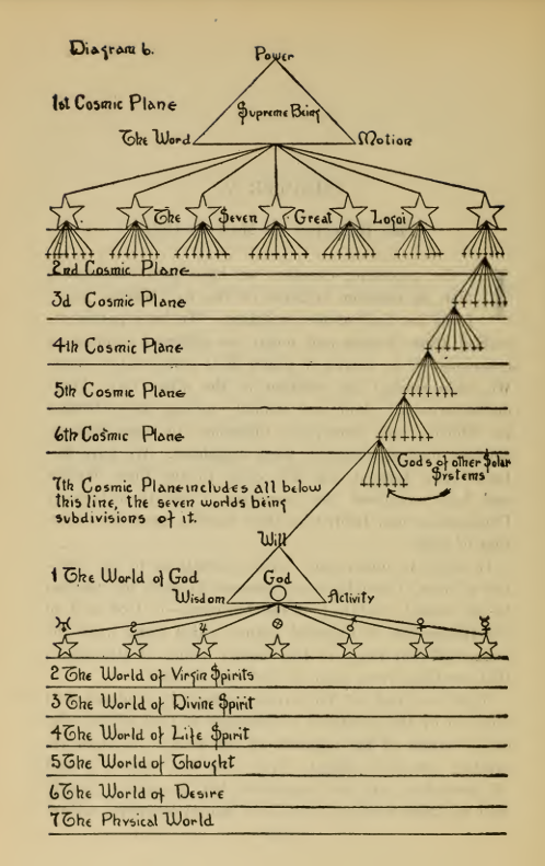From this threefold Supreme Being proceed the seven Great Logoi. They contain within Themselves all the great Hierarchies which differentiate more and more as they diffuse through the various Cosmic Planes. (See diagram 6). There are forty-nine Hierarchies on the second Cosmic Plane; on the third there are 343 Hierarchies. Each of these is capable of septenary divisions and subdivisions, so that in the lowest Cosmic Plane, where the Solar System manifest, the number of divisions and subdivisions is almost infinite.