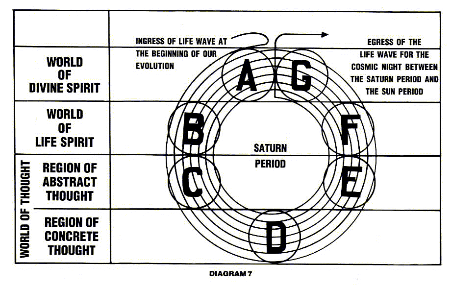 The Saturn Period is the first of the seven Periods, and at this early stage the virgin spirits take their first step towards the evolution of Consciousness and Form. By reference to diagram 7 it will be seen that the evolutionary impulse travels seven times around the seven Globes, A, B, C, D, E, F and G, the arrows showing the direction.
