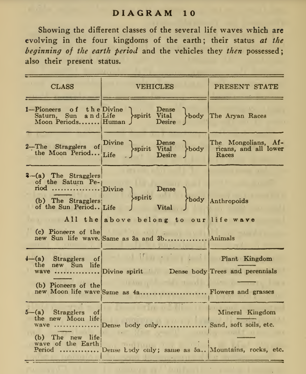 Speaking generally, class 5 in the foregoing list was given the germ of the divine spirit during the seventh Revolution, when the Lords of Flame reappeared. Therefore they were pioneers of the last life wave, entering evolution at the Moon Period. They passed their mineral existence there. The stragglers of that life wave were thus left with only the germ of a dense body.