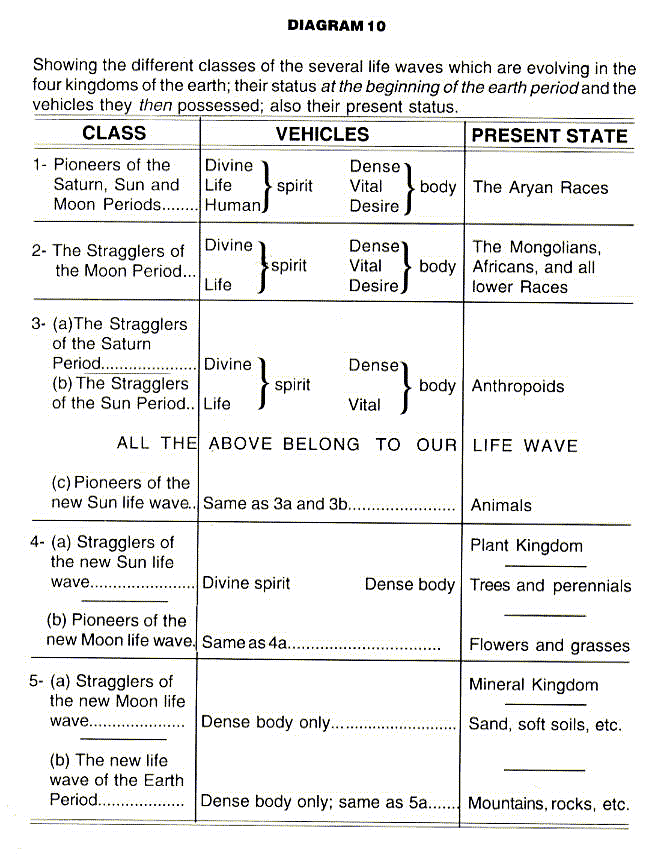 Thus, the three last named all possessed the same vehicles at the beginning of the Earth Period, although only the two first named (class 3a and 3b in diagram 10) belong to our life wave, and have a chance of even yet overtaking us if they pass the critical point which will come in the next Revolution of the Earth Period. Those who cannot pass that point will be held over until some future evolution reaches a stage where they can drop in and proceed with their development in a new human period. They will be debarred from going forward with our humanity because it will be advanced so far beyond their status that it would prove a serious clog to our progress to drag them along. They will not be destroyed, but simply held in waiting for another period of evolution.