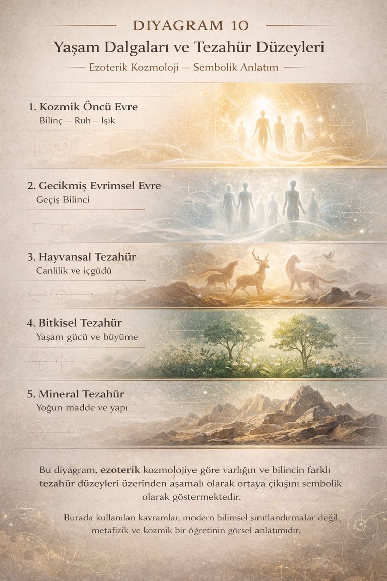 Ay Dönemi’nin sonunda bu sınıflar, Diyagram 10’da sınıflandırıldıkları biçimde araçlara sahipti ve Dünya Dönemi’nin başında bunlarla yola çıktılar. O zamandan beri geçen süre içinde insan krallığı, zihin bağını (mind link) geliştirdi ve böylece tam uyanık bilince ulaştı. Hayvanlar bir arzu bedeni, bitkiler bir yaşamsal beden elde etti; Ay Dönemi’nde evrime giren yaşam dalgasının geride kalanları kaya topraklarının sert koşullarından kurtuldu; Dünya Dönemi’nde evrime giren yaşam dalgası ise sert kayaları ve taşları oluşturur.