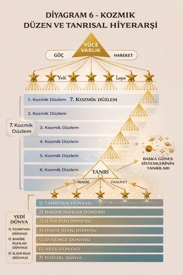 ve 11. diyagramlar konuyu açıklığa kavuşturabilir. Şunu akılda tutmak gerekir ki Dünyalar ve Kozmik Düzlemler uzayda üst üste dizilmiş değildir; yedi Kozmik Düzlem birbirinin içine geçmiştir ve yedi Dünyanın tümünü kuşatır. Bunlar ruh–madde hâlleridir; birbirlerinin içinden geçerler. Bu nedenle Tanrı ve anılan diğer büyük Varlıklar uzayda uzak değildir. Kendi âlemlerinin ve kendilerinden daha yoğun âlemlerin her noktasına nüfuz ederler. Hepsi bizim dünyamızda mevcuttur ve kelimenin tam anlamıyla “ellerimizden ve ayaklarımızdan daha yakındırlar.” “O’nun içinde yaşar, hareket eder ve var oluruz” sözü harfiyen doğrudur. Çünkü hiçbirimiz, dünyamızı yaşamlarıyla kuşatan ve ayakta tutan bu büyük Zekâların dışında var olamayız.