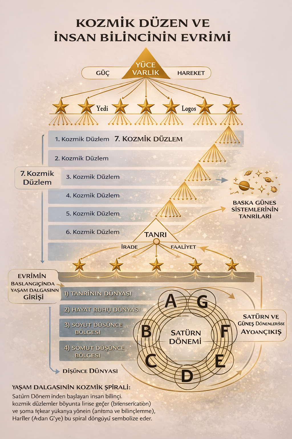 ROSICRUCIAN KOZMİK TASAVVURU BÖLÜM 6: EVRİM PLANI. Bu Kozmik Kök-Madde, Evrensel Ruh’un negatif kutbunun bir ifadesidir. Tanrı dediğimiz büyük Yaratıcı Varlık ise (biz ruhlar olarak O’nun bir parçasıyız) aynı Evrensel Mutlak Ruh’un pozitif enerjisinin ifadesidir...