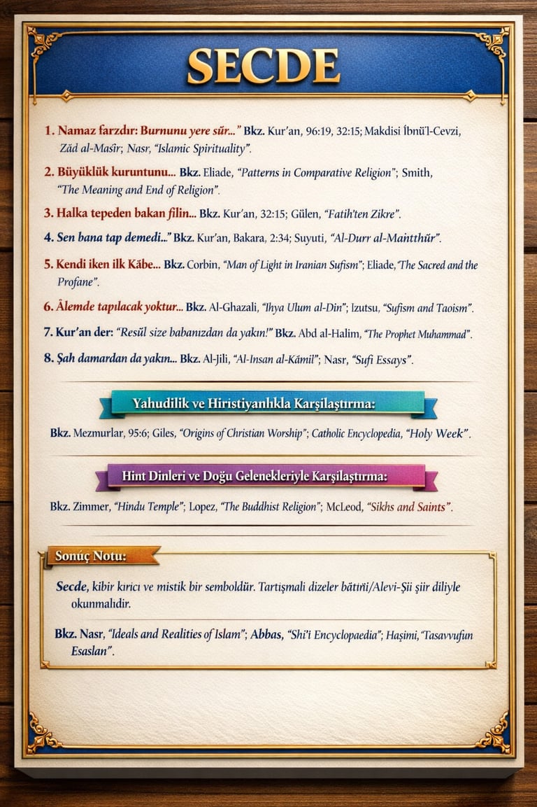 birincisi fıkhî-ritüel secde, ikincisi ahlâkî tevazu, üçüncüsü mistik antropoloji (Âdem/fıtrat/ruh), dördüncüsü ise kozmik itaat fikridir. Karşılaştırmalı dinler açısından secde; İslâm, Yahudilik, Hıristiyanlık ve Güney/Doğu Asya geleneklerinde farklı teolojik çerçeveler içinde yer alsa da, ortak çekirdeği çoğu kez kibrin kırılması ve kutsal karşısında bedenin eğitilmesidir. Şiirin en tartışmalı yerleri, “Muhammed-Âlî birdir”, “Âdem’den başka tapılacak yoktur” ve “Allah’ın her bir ismi fıtratta saklıdır” gibi mısralardır; bunlar ana akım akaid cümlesi olarak değil, Alevî-Şiî-irfânî/bâtınî şiir dili olarak okunmalıdır.