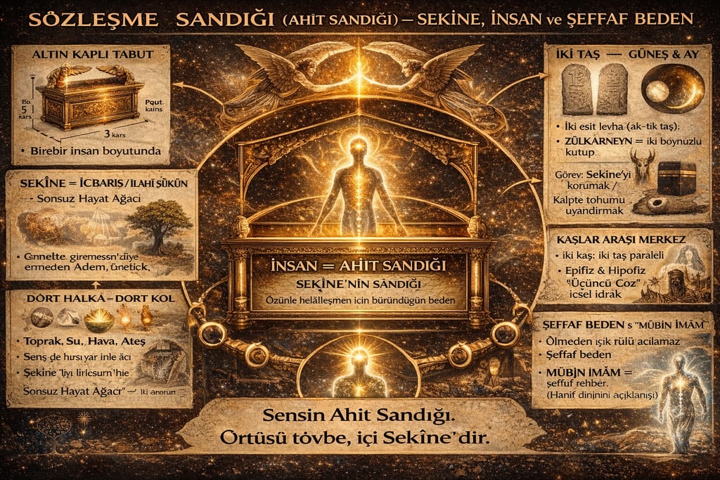 SÖZLEŞME SANDIĞI. Hani var ya ! Mûsâ’nın ‘“Kutsal ahit sandığı !”’ Değil o asla ! Halkın hayâl edip sandığı ! ‘“RAB târif etti onu !”’ ‘“Dağda, inceden ince !”’ Mûsâ da imâl etti ! Hemen dağdan inince !