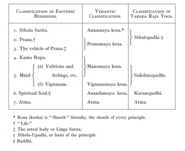 From the foregoing table it will be seen that the third principle in the Buddhist classification is not separately mentioned in the Vedantic division, as it is merely the vehicle of Prana. It will also be seen that the Fourth principle is included in the third Kosa (Sheath), as the same principle is but the vehicle of will-power, which is but an energy of the mind. It must also be noticed that the Vignanamaya Kosa is considered to be distinct from the Manomaya Kosa, as a division is made after death between the lower part of the mind, as it were, which has a closer affinity with the fourth principle than with the sixth ; and its higher part, which attaches itself to the latter, and which is, in fact, the basis for the higher spiritual individuality of man. We may also here point out to our readers that the classification mentioned in the last column is, for all practical purposes, connected with Raja Yoga, the best and simplest.