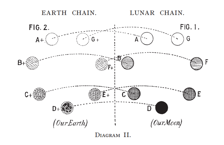 Imagine the six fellow-globes of the moon—æons before the first globe of our seven was evolved—just in the same position in relation to each other as the fellow-globes of our chain occupy in regard to our Earth now. (See in “ Esoteric Buddhism,” “ The Constitution of Man,” and the “ Planetary Chain.”) And now it will be easy to imagine further Globe A of the lunar chain informing Globe A of the terrestrial chain, and—dying ; Globe B of the former sending after that its energy into Globe B of the new chain ; then Globe C of the lunar, creating its progeny sphere C of the terrene chain ; then the Moon (our Satellite) pouring forth into the lowest globe of our planetary ring—Globe D, our Earth—all its life, energy and powers ; and, having transferred them to a new centre becoming virtually a dead planet, in which rotation has almost ceased since the birth of our globe.