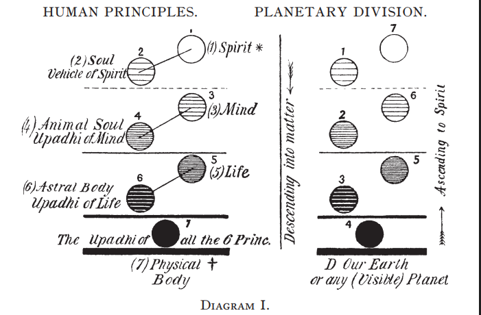 As we are proceeding here from Universals to Particulars, instead of using the inductive or Aristotelean method, the numbers are reversed. Spirit is enumerated the first instead of seventh, as is usually done, but, in truth, ought not to be done. Or as usually named after the manner of Esoteric Buddhism and others : 1, Atma ; 2, Buddhi (or Spiritual Soul) ; 3, Manas (Human Soul) ; 4, Kama Rupa (Vehicle of Desires and Passions) ; 5, Linga Sarira ; 6, Prana ; 7, Sthula Sarira.