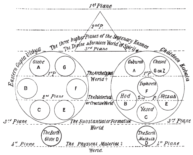 (a) Here, having finished for the time being with our side-issues— which, however they may break the flow of the narrative, are necessary for the elucidation of the whole scheme—the reader must return once more to Cosmogony. The phrase “ Older wheels ” refers to the worlds or Globes of our chain as they were during the “ previous Rounds.” The present Stanza, when explained esoterically, is found embodied entirely in the Kabalistic works. Therein will be found the very history of the evolution of those countless Globes which evolve after a periodical Pralaya, rebuilt from old material into new forms. The previous Globes disintegrate and reappear transformed and perfected for a new phase of life. In the Kabala, worlds are compared to sparks which fly from under the hammer of the great Architect—law, the law which rules all the smaller Creators. The following comparative diagram shows the identity between the two systems, the Kabalistic and the Eastern. The three upper are the three higher planes of consciousness, revealed and explained in both schools only to the Initiates, the lower ones represent the four lower planes—the lowest being our plane, or the visible Universe. These seven planes correspond to the seven states of consciousness in man. It remains with him to attune the three higher states in himself to the three higher planes in Kosmos. But before he can attempt to attune, he must awaken the three “ seats ” to life and activity. And how many are capable of bringing themselves to even a superficial comprehension of Atma-Vidya (Spirit-Knowledge), or what is called by the Sufis, Rohanee ! In Section the VIIth of this Book, in Sub-section 3, the reader will find a still clearer explanation of the above in the Commentary upon Saptaparna—the man-plant. See also the Section of that name in Part II. differentiation.* In theogony, every Seed is an ethereal organism, from which evolves later on a celestial being, a God.