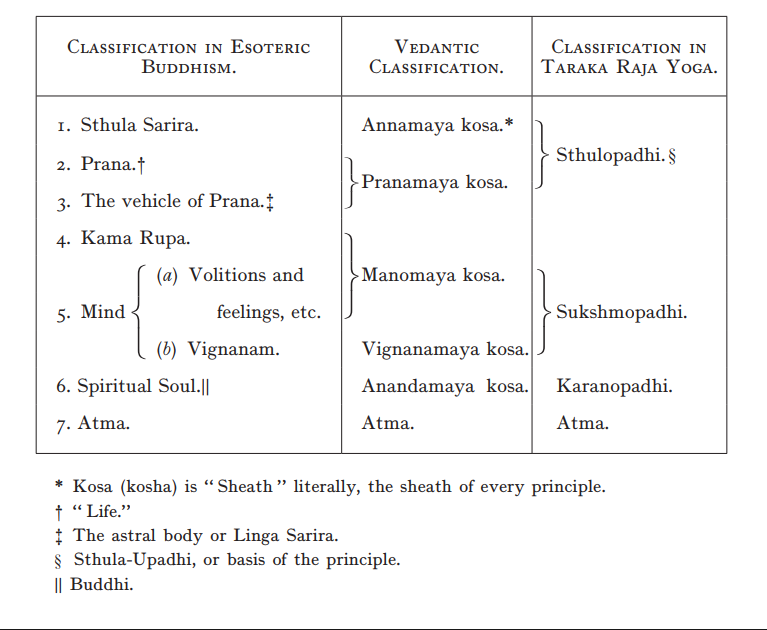 “ We give below in a tabular form the classifications adopted by the Buddhist and Vedantic teachers of the principles of man :