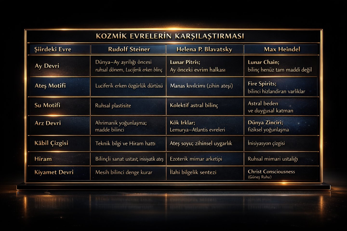 Şiirdeki “Hiram” figürü Heindel’de masonik ustalığın ve ruhsal mimarinin sembolüdür. Blavatsky’de Hiram benzeri figürler ezoterik mimar, yani kozmik planı maddede inşa eden bilinç olarak görülür. Steiner’de ise Hiram, Kâbil hattının temsilcisidir; teknik bilgi ve bilinçli sanat ustalığının taşıyıcısıdır.