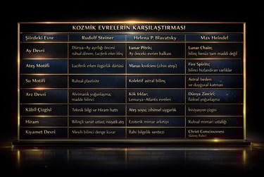 Son olarak “Mesih” motifi Heindel’de Güneş Ruhu olarak tanımlanır; Dünya’ya inen kozmik sevgi ve denge bilincidir. Blavatsky’de Mesih ilkesi, Evrensel Logos yani ilahi bilgelik akımıyla özdeşleşir. Steiner’de ise Mesih, Lucifer ile Ahriman arasındaki kozmik dengeyi kuran merkezî bilinçtir; insanlığın evriminde dengeleyici eksendir.