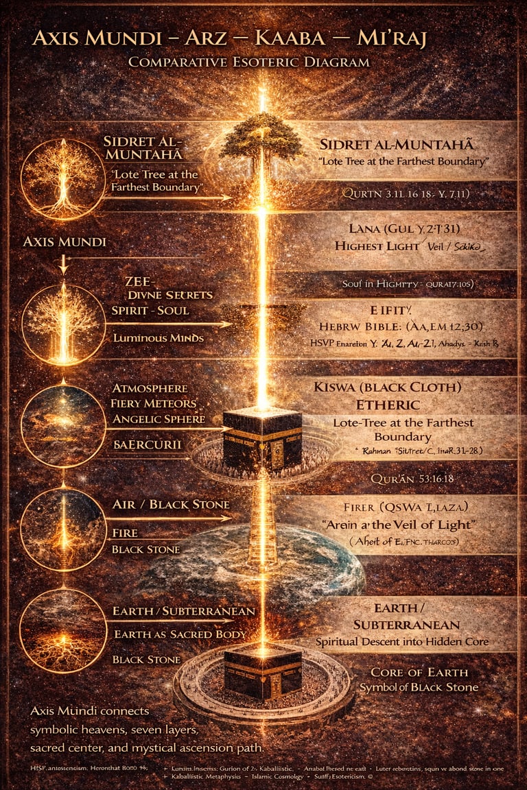 Practices like circumambulation (tawaf, pradakshina) move around the axis, while ascension myths move along it. Together they enact a complete sacred geometry: center + circle + vertical line.
