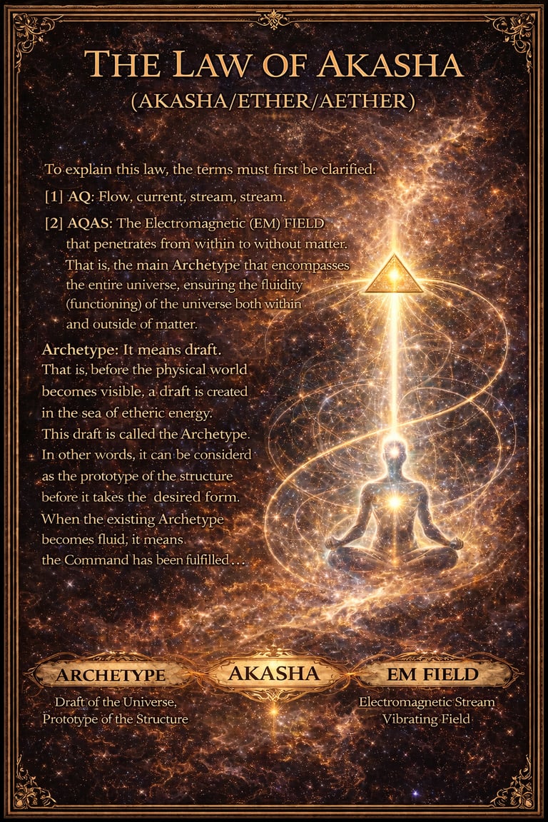 AQAŞ: The Electromagnetic (EM) FIELD that penetrates from within to without matter. That is, the main Archetype that encompasses the entire universe, ensuring the fluidity (functioning) of the universe both within and outside of matter. Archetype: It means draft. That is, before the physical world becomes visible, a draft is created in the sea of etheric energy. This draft is called the Archetype. In other words, it can be considered as the prototype of the structure before it takes the desired form. When the existing Archetype becomes fluid, it means the Command has been fulfilled.