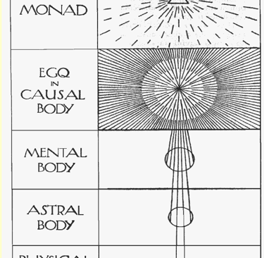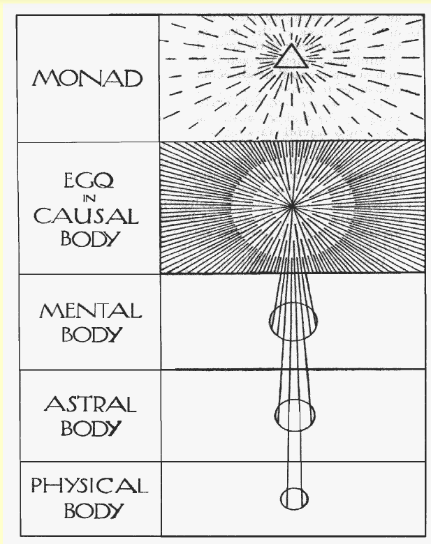 The effort to cultivate abstract thinking is also useful, thus raising the lower mind towards the higher, as well as drawing into the mental body the subtlest materials of the lower mental levels. This Diagram is an attempt to give some idea of the relationship between the ego and his lower vehicles. Of the powers, faculties, and knowledge of the ego on his own plane, only a small fraction can be transmitted to the mental body; from this again, still less penetrates to the astral body; and of this but a fragment reaches the consciousness in the physical body. One of the aims of the man should be, as we have seen, so to widen and strengthen the link between the ego and the lower bodies that more and more of the powers of the ego can find expression in the lower vehicles of the personality. Above and beyond the ego resides the Monad, whose relationship to the ego is somewhat similar to that which exists between the ego and the personality.