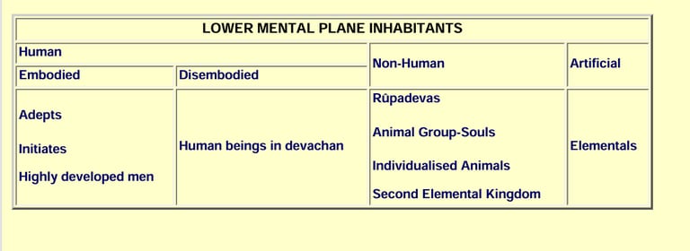 Since the products of man's evil passions, which bulk so largely the astral world, cannot exist on the mental plane, the sub-divisions we shall have to consider will naturally be far fewer than in the case of astral entities. The following table sets out the main classes: