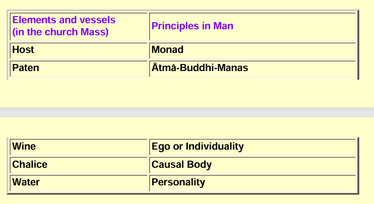In the Christian Church, the sacrament of Confirmation is intended to widen and strengthen the link between the ego and the personality. After the preliminary widening of this channel, the divine power rushes through the ego of the bishop into the higher manas of the candidate. At the signing of the cross, it pushes upwards into the buddhic principle, and from there into the âtmâ or spirit. The effect upon âtmâ is reflected in the etheric double, that upon the buddhi is reproduced in the astral body, and what is done to the higher manas should be similarly mirrored in the lower mind. This result is not merely temporary, for the opening up of the connections made a wider channel through which a constant flow can be kept going.