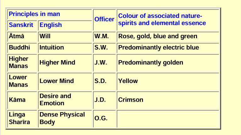 What the Western man usually calls his mind, with its powers of concrete and abstract thought, is the last two in the above classification, viz., Manas and Chitta. The Theosophist should recognise in the Vedantic divisions his own familiar âtmâ, buddhi, manas, and the lower mind. In the symbolism of Freemasonry, the lower mind and the mental body are represented by the S.D. The following table sets out the principles of man in the system of Freemasonry: