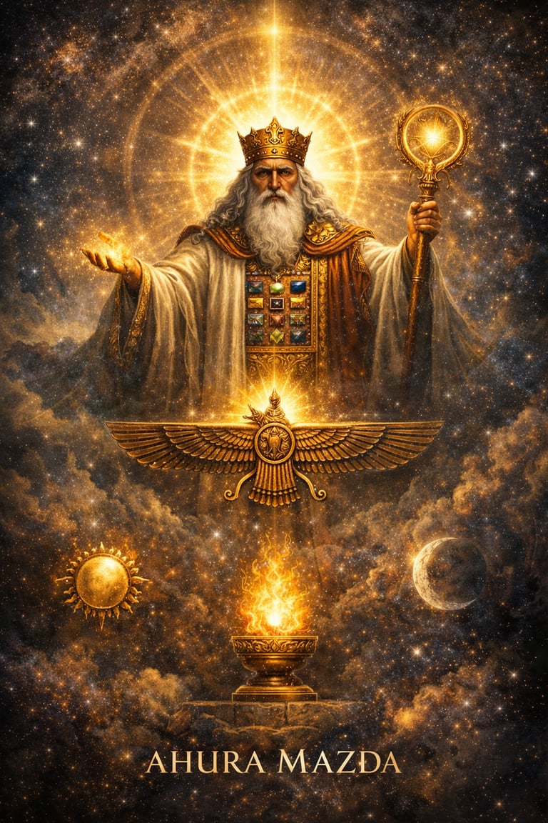 The text correctly identifies Ahura Mazda as the supreme deity of Zoroastrianism, whose name literally means “Wise Lord” (Avestan: Ahura = lord, Mazdā = wisdom). In the Zend Avesta, Ahura Mazda is not a creator ex nihilo in the Abrahamic sense, but the principle of wisdom, truth (Asha), and light governing the cosmos.¹