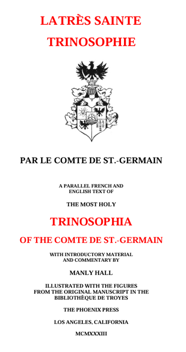 The parts of the paragraphs attributed to the Hungarian adept are not clearly indicated, but as the entire text deals with the significance of numbers, it is reasonable to infer that his commentaries are mystical interpretations of the numerals 4 and 5. Both paragraphs are in substance similar to the Puissance des nombres d’après Pythagore by Jean Marie Ragon. The Mahatma Koot Hoomi mentions a "ciphered MS." by St.-Germain which remained with his staunch friend and patron the benevolent Prince Charles of Hesse-Cassel (See Mahatma Letters to A. P. Sinnett). Comparatively unimportant references to St.-Germain, and wild speculations concerning his origin and the purpose of his European activities, are available in abundance, but the most exhaustive search of the work of eighteenth century memoir writers for information regarding the Masonic and metaphysical doctrines which he promulgated has proved fruitless. So far as it has been possible to ascertain, the present translation and publication of La Très Sainte Trinosophie affords the first opportunity to possess a work setting forth . . . in the usual veiled and symbolic manner . . . the esoteric doctrines of St.-Germain, and his associates.