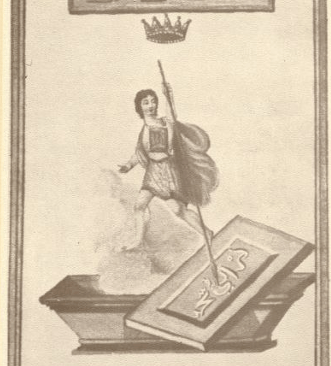 The effort is vain. No chains forged of earth can restrain or bind the Philosphical Mercury. We are told that in the alchemical processes this subtile essence can seep through an iron vessel (the warrior)—or through glass or porcelain—and vanish, in spite of every effort to capture its quintessence. The eleventh figure contains numerous extraordinary and impressive hieroglyphics. The characters on the shield include a crossed scythe and sceptre—signifying death and resurrection, or mortality and sovereignty. There is also the axe-blade, the hieroglyph of the hewer, the builder, or the geometrician. The smaller hieroglyphics mean egg and cave, and the lunar crescent may symbolize either a lunar quarter or a gateway. These symbols unquestionably refer to steps in the initiatory drama.