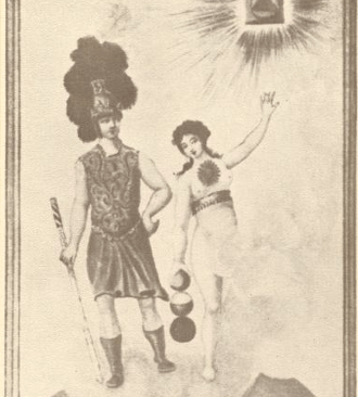 THE hall into which I had just entered was perfectly round; it resembled the interior of a globe composed of hard and transparent matter, as crystal, so that the light entered from all sides. Its lower part rested upon a vast basin filled with red sand. A gentle and equable warmth reigned in this circular enclosure. The sages call this hall The basin of sand sustaining it is called With astonishment I gazed around this crystal globe when a new phenomenon excited my admiration. From the floor of the hall ascended a gentle vapor, moist and saffron yellow. It enveloped me, raised me gently and within thirty six days bore me up to the upper part of the globe. Thereafter the vapor thinned; little by little I descended and finally found myself again on the floor. My robe had changed its colour. It had been green when I entered the hall, but now changed to a brilliant red. A contrary effect had taken place in the sand on which the globe rested. Gradually its red colour had been transformed into black. After finishing my ascent I remained three more days in that hall. After that time I left it in order to enter a large place surrounded by colonades and guilded porticos. In the center of the place stood a bronze pedestal supporting a group representing a large strong man whose majestic head was covered with a crowned helmet. A blue garment protruded through the meshes of his golden armour. In one hand he held a white staff bearing certain characters, the other hand he extended toward a beautiful woman. His companion wore no garment,but a sun radiated from her breast. Her right hand held three globes joined by golden rings; a coronet of red flowers confined her beautiful hair. She sprang into the air and seemed to lift with her the warrior who accompanied her; both were borne up by the clouds about the group. On the capitals of four white marble columns were set four bronze statues; they had wings and appeared to sound trumpets. I crossed the place, and mounting on a marble platform which was before me, I noticed with astonishment that I had re-entered the hall of Thrones (the first in which I had found myself when entering the Palace of Wisdom). The triangular altar was still in the center of this hall but the bird, the altar and the torch were joined and formed a single body. Near them was a golden sun. The sword which I had brought from the hall of fire lay a few paces distant on the cushion of one of the thrones; I took up the sword and struck the sun, reducing it to dust. I then touched it and each molecule became a golden sun like the one I had broken. At that instant a loud and melodious voice exclaimed,"The work is perfect!" Hearing this, the children of light hastened to join me, the doors of immortality were opened to me, and the cloud which covers the eyes of mortals, was dissipated. I SAW and the spirits which preside over the elements knew me for their master.