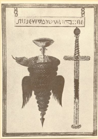 In the Chaldean Oracles the Universal Fire is described as moving with a serpentine motion. The present symbol is the Universal Wisdom moving as a winged serpent upon the surface of the primitive chaos—that is, the unregenerated body of the neophyte. The ritual of the Sabazian Mysteries included the drawing of a live snake across the breast of the candidate. In the drawing, the serpent is twisted around the backbone—the spear—and forms an appropriate support for the cup of immortality. Beside this strange altar stands the jewelled sword. Faintly traceable upon its sheath are the ancient symbols of the eye, the heart, and the mouth, symbolic of the three persons of the Creative Triad—life in the heart, light in the eye, breath in the mouth.