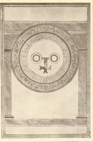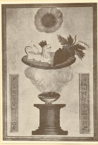 A curious work on alchemy states that the grape has a special affinity for gold, and that when vineyards are planted in areas where gold is abundant, the roots of the vine absorb the minute particles of this precious metal and distribute them throughout its stalk, leaves, and fruit. In alchemy, gold is the symbol of the Supreme Principle. The Nazarene likened His disciples and Himself to a vine with its fruits. The grape cluster is an appropriate symbol for the school of the adepts, for the Initiates grow together upon a single branch. Here also is a subtle allusion to the blood, which carries within it the golden particles of the sun. The lion and the grapes restate the old formula wisdom and generation. The panels of characters on either side of the brazier contain fragments from old rituals and mystery texts. The one upon the right reads: "Kindle a light at the appointed time—the seventh hour of the dawning." This is followed by an obscure reference to the coming forth of five at the full sun (noon) and the panel concludes with the admonition: "Dance in a circle and prophecy.
