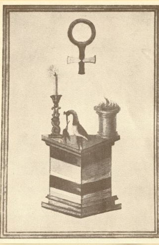 This part contains some of the most beautiful symbolism in the entire manuscript. The candidate, having transcended the four elements, now continues into the sphere of higher causations, where he is instructed in the great Cabbalistic principles by which the universal integrity is preserved. The palace is the archetypal sphere—Plato’s world of Ideas. The simple geometric arrangement reveals the divine harmony. The doors of the archetypal world swing open and the Hierophant of the Order comes forth. It is He who was called the Master of the Hidden House, the Initiator, the Keeper of the Keys of Thoth. Alchemy is a religion of fire, as is also Zarathustrism. The Magus therefore wears the insignias of Zoroaster and speaks in the language of the Fire Prophet. The names which the Hierophant gives to the bird, the torch and the altar are the same as those given in the preceding section. In company with the Initiator the candidate enters the immense temple, whose 360 columns leave no doubt as to its identity with the universe. The altar already described, being the threefold cause of the material sphere, is placed in the center of the great hall. The Hierophant next informs the disciple as to the new names which have been bestowed upon the sacred objects. The bird is called Ampheercha, which is interpreted to mean that a mother shall bear the likeness, or double.