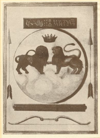 "Kill out desire," decrees the eastern master. "Slay ambition," wrote the western sage. The clouds upon which the lions stand signify the unsubstantiality of the world’s pomp and circumstance, while in the clear sky above, the golden Crown floats unsupported. Wisdom is a sufficient foundation for itself, but all other bodies and conditions depend for their support upon the frail stuff "that dreams are made on." The panel above the lions commands that man should bend the knee and worship the all-powerful God who sends forth His love in winged splendor from the first angle of the world. (Aries.) It also informs that the sixth sign, which is mighty and powerful, is the ending and completion of the ages. Virgo, the sixth sign of the zodiac, is the symbol of service and renunciation by which the lions may be overcome. He who gives up life for wisdom shall receive a fuller life. Beneath the lions is a panel containing Greek characters which mean: "Each must sprinkle himself with his own wine from the mountain of Chios. He must drink to God before the wood. He must give himself in exchange for that for which he yearns." These words are from an old ritual. Wood was the symbol of Dionysius and it was in honor of this god of the wood and of the vine that the ritual of the Communion was first established. To drink of one’s own blood or to sprinkle oneself with his own wine is to be immersed in or tinctured by the inner soul power.