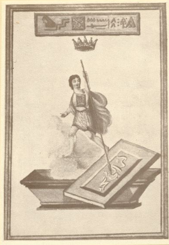 A man robed in a green garment edged with gold, and bearing a lance, is arising amidst vaporous clouds from an open sarcophogus. Above the human figure is suspended a golden crown of light. The whole symbolizes the annual rebirth of the sun in the tenth zodiacal sign—the winter solstice in Capricorn. As the tenth month of the philosophic year, this hieroglyph sets forth the first of the three Greater Mysteries which are presided over by the constellations of Capricorn, Aquarius, and Pisces. The drawing depicts the final victory of the spiritualized soul over the limitations of the bodily tomb. The green garment reveals the adept to be clothed in his illumined soul, which is under the rulership of Venus. The breastplate bears upon it cryptic letters which mean LIFE. The Initiate has achieved immortality. For him the tomb will be forever empty. He has become one of that small band of the enlightened "whom death has forgotten." The Arabic characters on the lid of the coffin admonish the Elect that they should seize upon a certain undesignated mystery "when the sixth sign or age is to be the breath." These words evidently refer to the parts of a ritual. That which is to be seized upon is the "master secret of alchemy." The tomb is also the burial place of the master of magic whose dernier (or body) was hidden, according to an earlier figure.