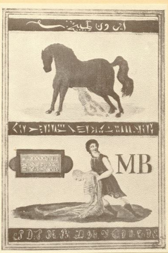 A candidate for initiation into the Mysteries stands in symbolic posture before an altar—with "one shoe off and one shoe on." The Hebrew letters AL (EL) in the small circle are one of the ten Cabbalistic names of God signifying "God, the Creator," and is associated with the Sephira Chesed or mercy. The letters AB are the mystical signature of the writer who was a "father" (abba) or master of the secret wisdom. The letters are also an abbreviation for an alchemical process. The Arabic "divine name" really consists of Hebrew words written in Arabic characters which read: "The Lord, the Most High, purifies." The Hebrew inscription in the lower left corner, while unquestionably the second verse of the first chapter of Genesis, does not read as in the Authorized Version. Characters have been changed and the sense altered to read in substance: "And the earth shall be a desolate waste. There shall be lamenting, and hate and consternation shall be upon the Face. And the Breath of El-him, because of the presence of the spirit, shall destroy those that have departed from God."