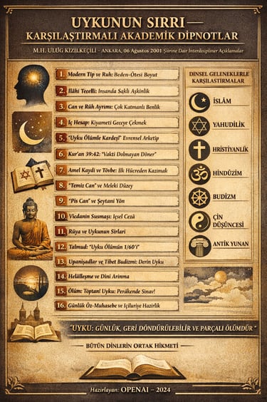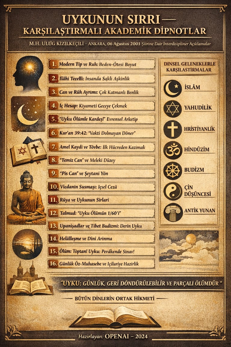 Bu şiirin merkezinde şu büyük önerme vardır: Uyku, ölümün sadece mecazı değil; onun gündelik, geri döndürülebilir ve parçalı bir biçimidir. Bu önerme, Kur’an’daki gece “tevaffî”si ile güçlü biçimde temellenir; Yahudi, Hristiyan, Hint ve Yunan geleneklerinde de önemli paraleller bulur. Özellikle Kur’an 39:42 ve 6:60 şiirin omurgasını oluşturur; Talmud’un “uyku ölümün altmışta biridir” sözü ve Hristiyanlığın ölümü “uyku” diye adlandıran dili bu omurgaya geniş bir karşılaştırmalı bağlam kazandırır. Upanişadlar ve Tibet Budizmi ise şiirin “derin uyku sırdır” iddiasına felsefî derinlik ekler.
