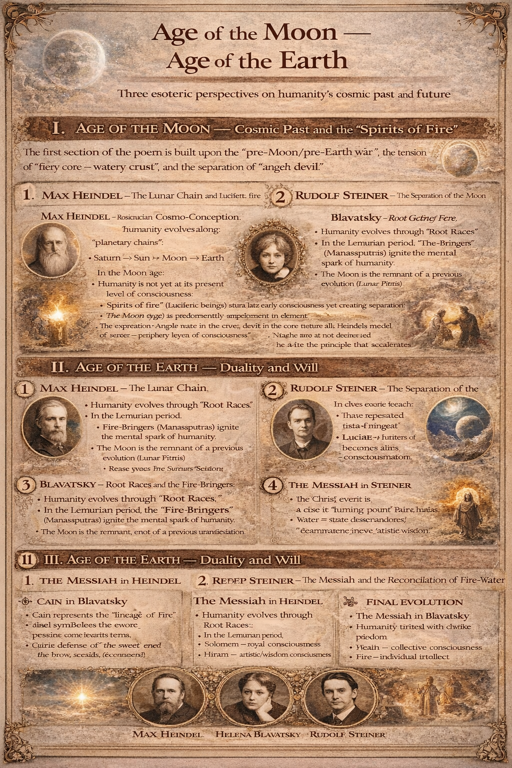 The “Age of the Moon” motif corresponds, in Max Heindel’s cosmology, to the “Lunar Chain” stage through which humanity passes; here consciousness has not yet attained its present material density. In Blavatsky, this period is explained through the doctrine of the “Lunar Pitris,” the Moon ancestors; they are the remnants of humanity’s previous evolutionary cycle. In Rudolf Steiner, the Moon was once united with the Earth and later separated; this “Moon separation” is a cosmic event that makes the independence of the human ego possible.